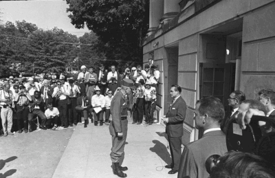 The last example of a president federalizing troops over the objection of a state government dates to Jim Crow segregation, a period marked by legal practices that routinely denied due process and citizenship rights to Black Americans in the South. In the 1960s, numerous Black freedom struggles took stands against this authoritarianism backed by militarized law enforcement. Gov. George Wallace is confronted by a US general.