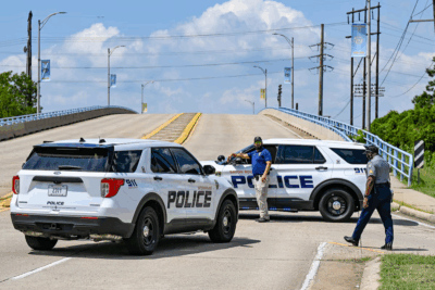 At least five historically Black colleges and universities received violent threats on Thursday, prompting several of them to place their campuses on lockdown and cancel classes. Baton Rouge Police block the entrance of Southern University’s campus on Thursday. (Javier Gallegos/The Advocate/AP)