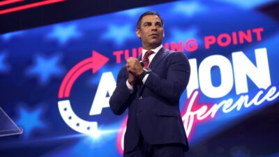 Miami Mayor Francis Suarez speaking with attendees at the 2023 Turning Point Action Conference in West Palm Beach, Florida, July 2023.